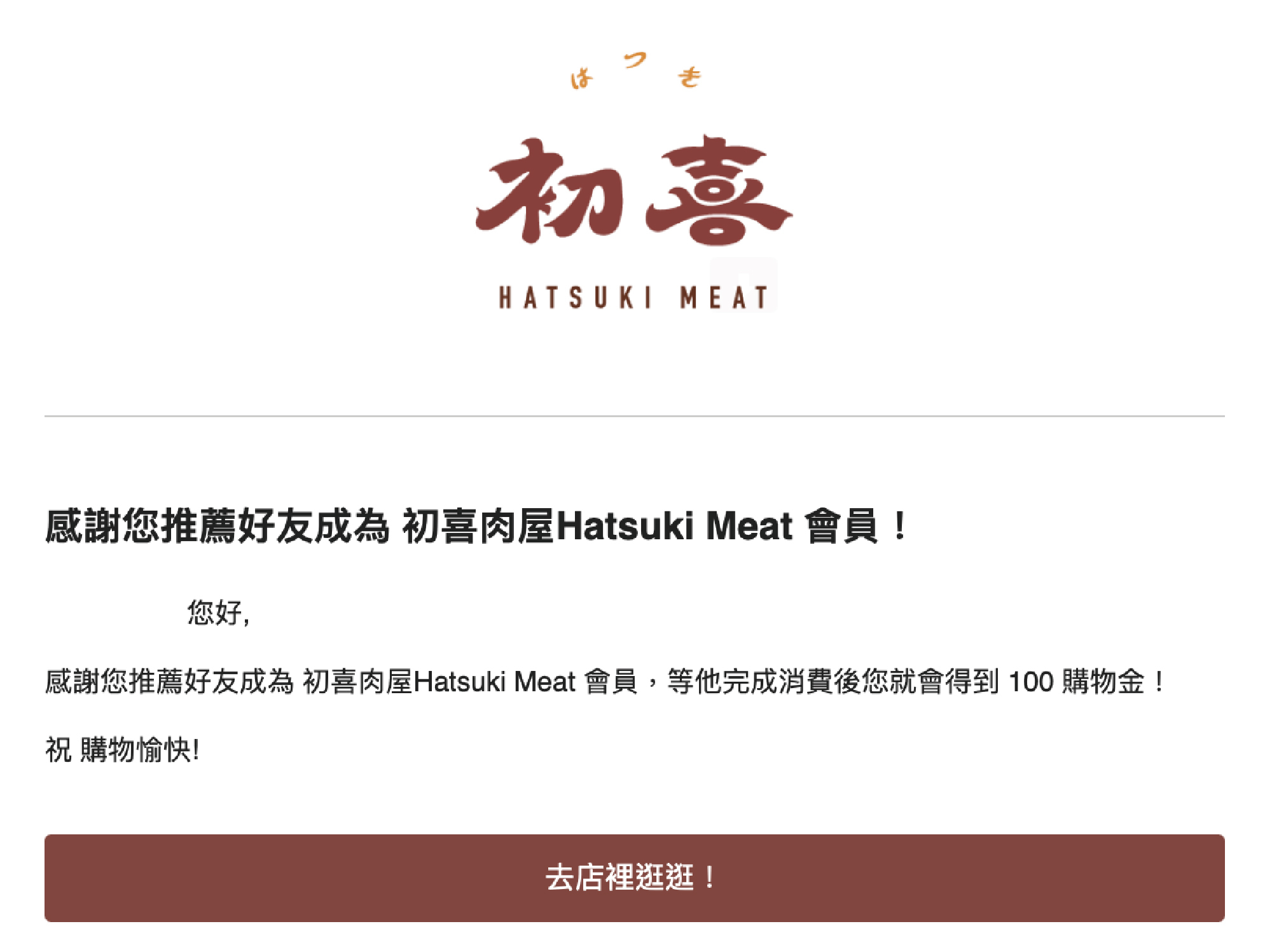 3.當新加入初喜肉屋的好友註冊成功,系統會自動發出信件通知推薦者。